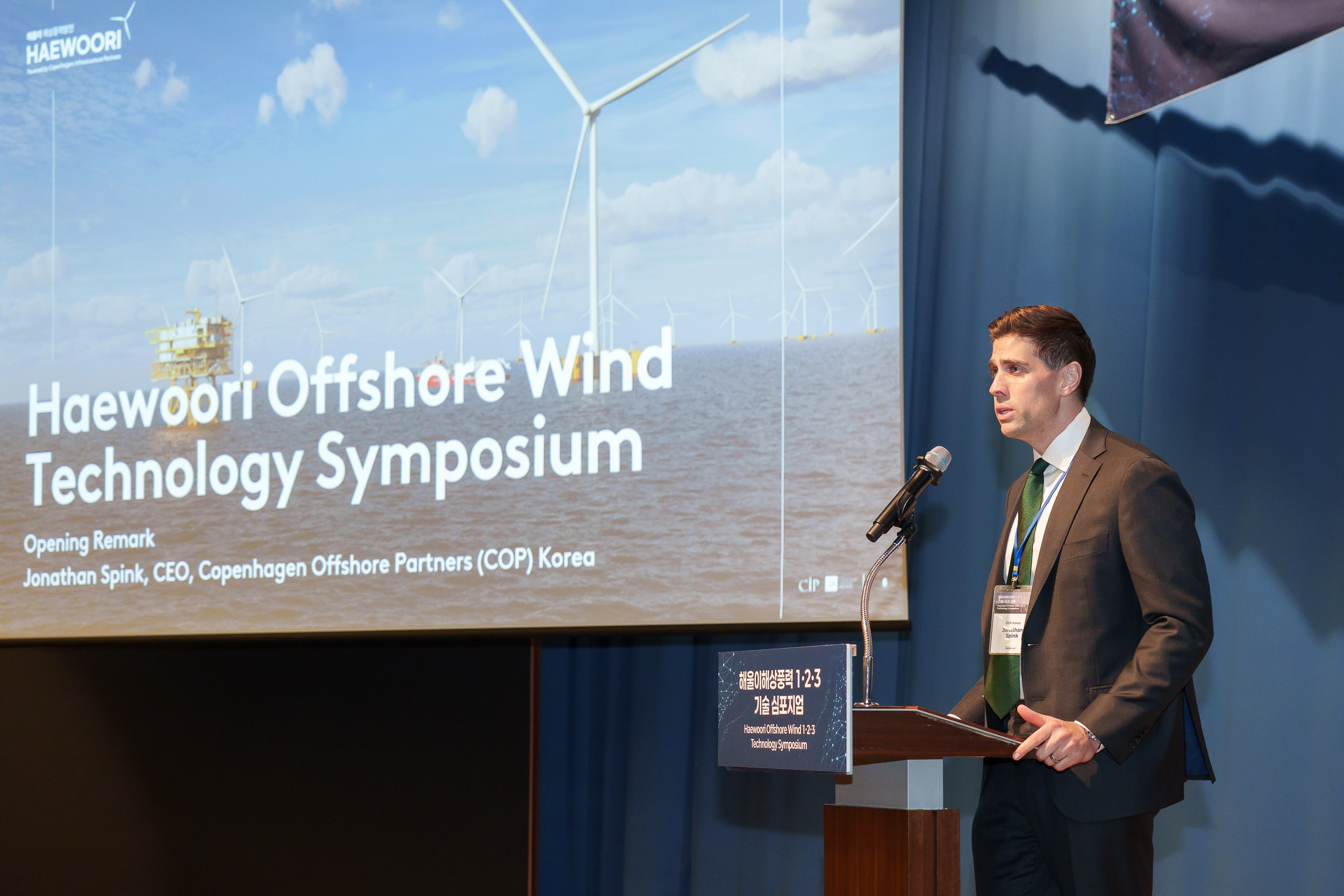 조나단 스핑크(Jonathan Spink) 코펜하겐 오프쇼어 파트너스(COP) 코리아 대표는 개회사와 함께 CIP 및 COP의 한국 해상풍력 포트폴리오와 해울이해상풍력1·2·3 프로젝트를 소개하며 이번 행사의 포문을 열었다. 이어 피에르 바가리아(Pierre Bagaria) COP 기술담당 상무가 글로벌 시장 전망과 영국 펜트랜드 부유식 해상풍력 발전단지 등 해외 부유식 해상풍력 사례를 발표하며 해울이해상풍력1∙2∙3 프로젝트의 기술적 우수성을 강조했다.